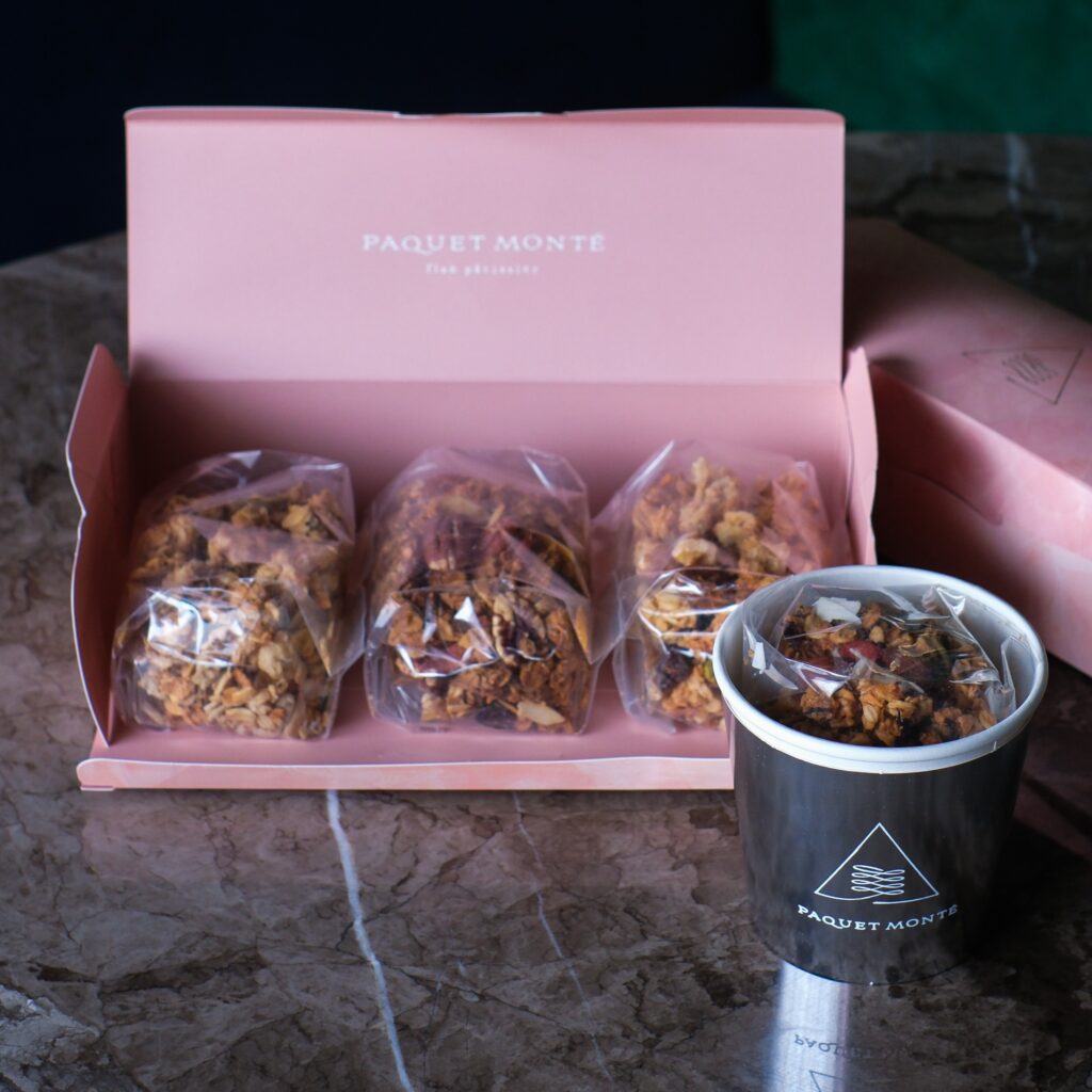 From sweet snack types to savory flavors, enjoy three varieties.Beautifully packed in a Paquet Monte original box — perfect for gifting.(Current lineup: Amazake Rice Flour Granola / Black Tea Rice Flour Granola / Black Pepper Rice Flour Granola)