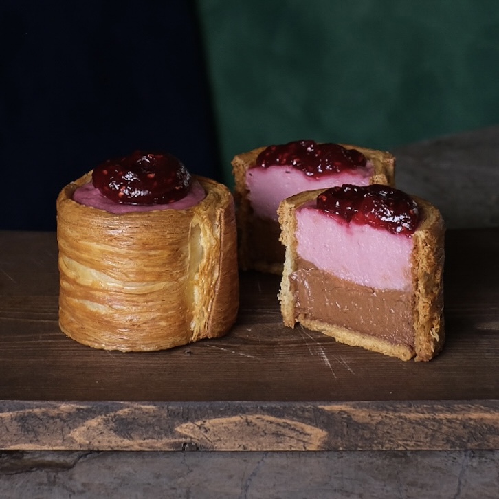 Two-tiered Flan featuring the sweet and tart flavor of raspberries and the rich aroma of cacao chocolate. This Valentine's Day, we're topping our flan with a heart-shaped pâte de fruits made from our homemade jam. Enjoy the marriage of flavorful chocolate from our neighbor, Minimal, and French raspberries. This sophisticated flan is perfect with coffee or your favorite alcoholic beverage.