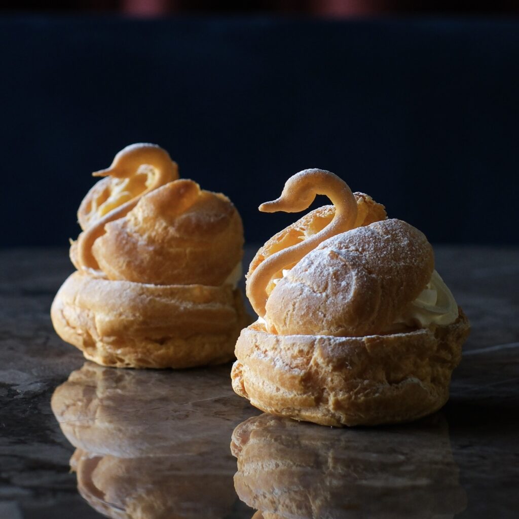Choux pastry filled with rich custard made from fresh Nagasaki eggs and vanilla, topped with whipped cream and shaped into an elegant swan.
