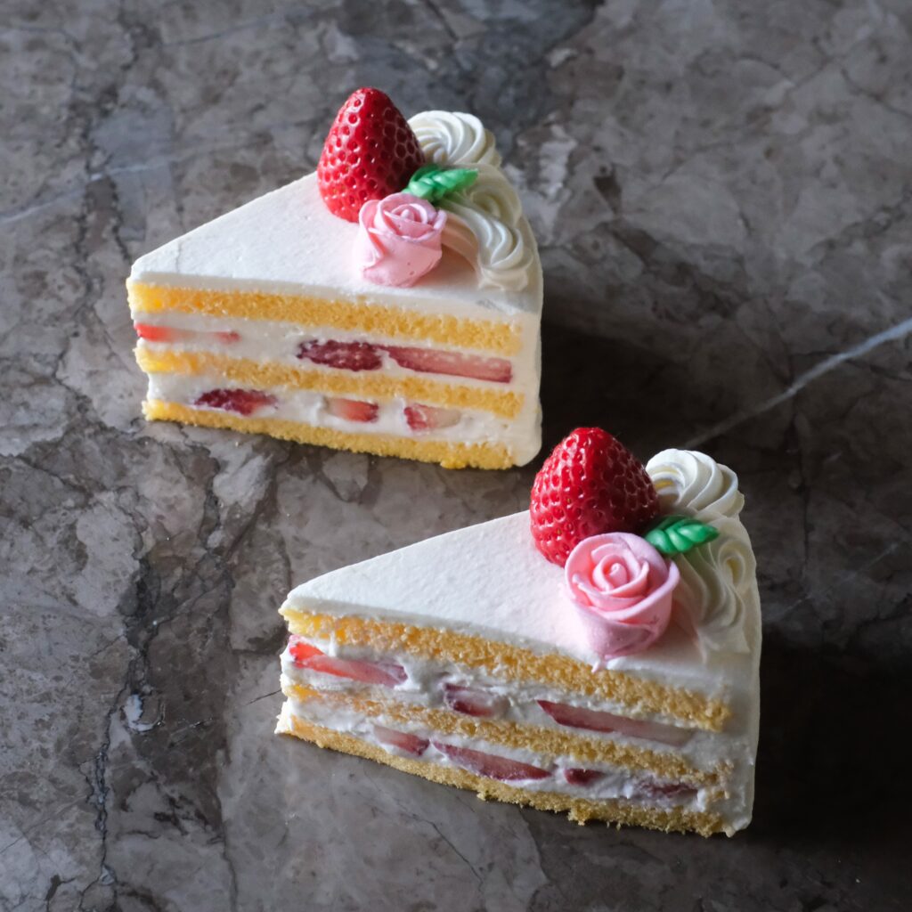 素材のバランスを大切にし、口に入れた瞬間に一体感が生まれる味わいを目指しました。しっとりふんわりと焼き上げたきめ細かなスポンジに、ミルキーな生クリームと、旬の苺を重ねます。2/15のみデコレーションが変わる予定です。※薔薇と葉っぱのデコレーションを除き全て無添加